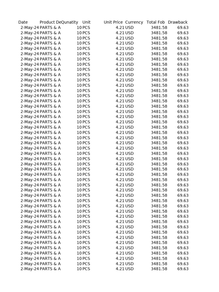 Qunatity Unit Unit Price Currency Total Fob Drawback