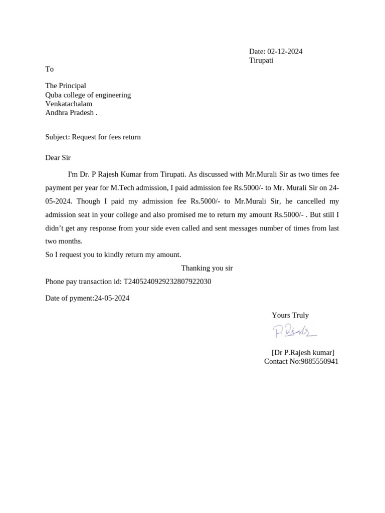 05-2024. Though I paid my admission fee Rs.5000/- to Mr.Murali Sir, he cancelled my