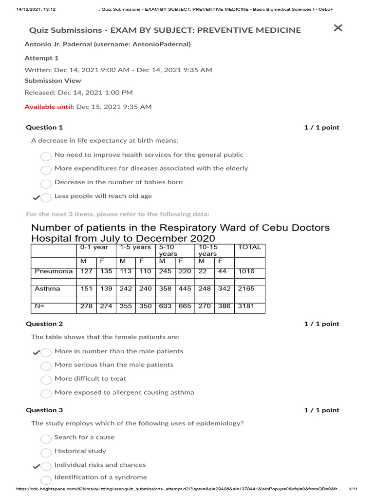 14/12/2021, 13:12 : Quiz Submissions - EXAM BY SUBJECT: PREVENTIVE MEDICINE - Basic Biomedical Sciences I - CeLo+