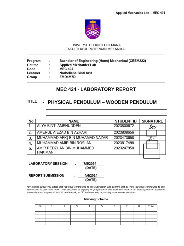 Physical Pendulum Lab Report - MEC 424