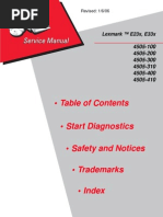 Preface . . . . . . . . . . . . . . . . . . . . . . . . . . . . . . . . . . . . . . . . . . . . . . . . vii Safety Information. . . . . . . . . . . . . . . . . . . . . . . . . . . . . . . . . . . . . . viii General Information . . . . . . . . . . . . . . . . . . . . . . . . . . . . . . . . . . . . 1-1 Power Consumption . . . . . . . . . . . . . . . . . . . . . . . . . . . . . . . . . . . . . 1-1 Internal Power Supply Specifications . . . . . . . . . . . . . . . . . . . . . . . . 1-2 Maintenance Approach . . . . . . . . . . . . . . . . . . . . . . . . . . . . . . . . . . 1-2 Tools Required For Service . . . . . . . . . . . . . . . . . . . . . . . . . . . . . . . 1-3 Abbreviations . . . . . . . . . . . . . . . . . . . . . . . . . . . . . . . . . . . . . . . . . . 1-3 Operator Panel and Menus . . . . . . . . . . . . . . . . . . . . . . . . . . . . . . . 1-4 Using the Operator Panel. . . . . . . . . . . . . . . . . . . . . . . . . . . . . . . 1-4 Menu . . . . . . . . . . . . . . . . . . . . . . . . . . . . . . . . . . . . . . . . . . . . . . 1-4 Select . . . . . . . . . . . . . . . . . . . . . . . . . . . . . . . . . . . . . . . . . . . . . . 1-4 Return . . . . . . . . . . . . . . . . . . . . . . . . . . . . . . . . . . . . . . . . . . . . . 1-4 Go . . . . . . . . . . . . . . . . . . . . . . . . . . . . . . . . . . . . . . . . . . . . . . . . 1-4 Stop . . . . . . . . . . . . . . . . . . . . . . . . . . . . . . . . . . . . . . . . . . . . . . . 1-4 Power Indicator States . . . . . . . . . . . . . . . . . . . . . . . . . . . . . . . . . 1-4 Operator Panel Button Functions. . . . . . . . . . . . . . . . . . . . . . . . . 1-5 Printer Messages . . . . . . . . . . . . . . . . . . . . . . . . . . . . . . . . . . . . . 1-6 Operator Panel Menus . . . . . . . . . . . . . . . . . . . . . . . . . . . . . . . . . . . 1-7 Printing the Menu Settings Page . . . . . . . . . . . . . . . . . . . . . . . . . 1-8 Changing Printer Settings . . . . . . . . . . . . . . . . . . . . . . . . . . . . . . 1-9 Disabling the Operator Panel Menus . . . . . . . . . . . . . . . . . . . . . 1-10 Diagnostic Information . . . . . . . . . . . . . . . . . . . . . . . . . . . . . . . . . 2-1 Start . . . . . . . . . . . . . . . . . . . . . . . . . . . . . . . . . . . . . . . . . . . . . . . . . 2-1 Service Messages . . . . . . . . . . . . . . . . . . . . . . . . . . . . . . . . . . . . 2-2 Error Indicator Table . . . . . . . . . . . . . . . . . . . . . . . . . . . . . . . . . . 2-3 User Status Messages . . . . . . . . . . . . . . . . . . . . . . . . . . . . . . . . . . 2-10 Warning Messages . . . . . . . . . . . . . . . . . . . . . . . . . . . . . . . . . . 2-13 Status Messages . . . . . . . . . . . . . . . . . . . . . . . . . . . . . . . . . . . . 2-14 Attendance Messages . . . . . . . . . . . . . . . . . . . . . . . . . . . . . . . . . . 2-24 Overriding Change Prompts. . . . . . . . . . . . . . . . . . . . . . . . . . . . 2-28 Paper Jams . . . . . . . . . . . . . . . . . . . . . . . . . . . . . . . . . . . . . . . . 2-41 Power-On Self Test (POST) Sequence . . . . . . . . . . . . . . . . . . . 2-49 Post Symptom Table . . . . . . . . . . . . . . . . . . . . . . . . . . . . . . . . . 2-50 Symptom Tables . . . . . . . . . . . . . . . . . . . . . . . . . . . . . . . . . . . . 2-51 Service Checks . . . . . . . . . . . . . . . . . . . . . . . . . . . . . . . . . . . . . . . 2-54 Maintenance Functions . . . . . . . . . . . . . . . . . . . . . . . . . . . . . . . 2-54 Maintenance Station Service Checks . . . . . . . . . . . . . . . . . . . . 2-56