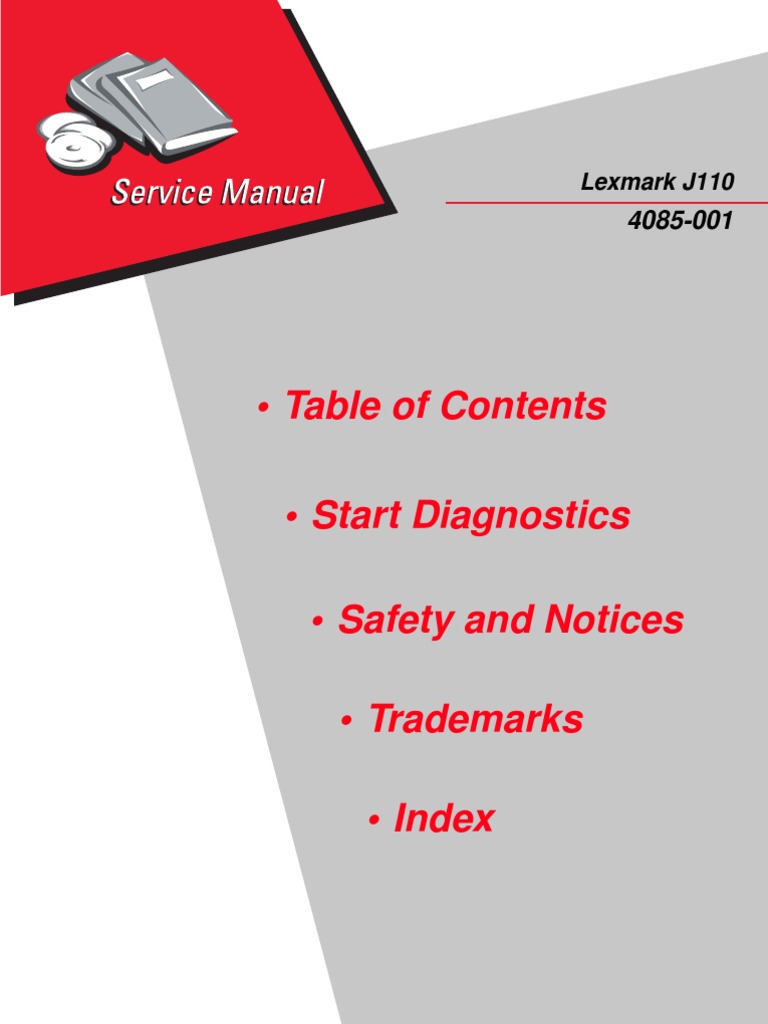 This manual describes the Lexmark J110 printer (4085-001) and contains maintenance procedures for service personnel only. It is divided into the following chapters: 1. General Information contains a general description of the printer and the maintenance approach used to repair it. Special tools and test equipment are listed in this chapter, as well as general environmental and safety instructions. 2. Diagnostic Information contains an error indicator table, symptom tables, and service checks used to isolate failing field replaceable units (FRUs). 3. Diagnostic Aids contains tests and checks used to locate or repeat symptoms of printer problems. 4. Repair Information provides instructions for making printer adjustments and removing and installing FRUs. 5. Connector Locations uses illustrations to identify the connector locations and test points on the printer. 6. Preventive Maintenance contains the lubrication specifications and recommendations to prevent problems. 7. Parts Catalog contains illustrations and part numbers for individual FRUs.