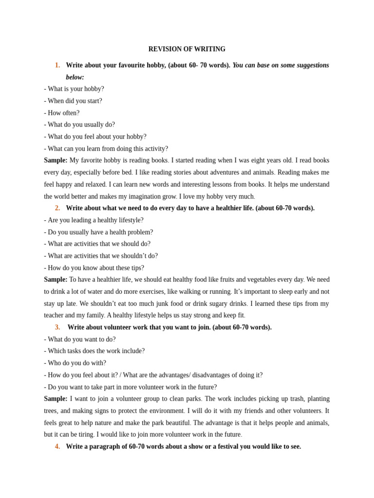 1. Write about your favourite hobby, (about 60- 70 words). You can base on some suggestions