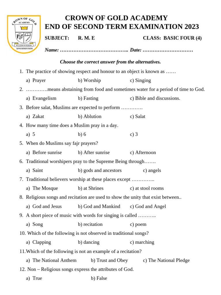 SUBJECT: R. M. E CLASS: BASIC FOUR (4)