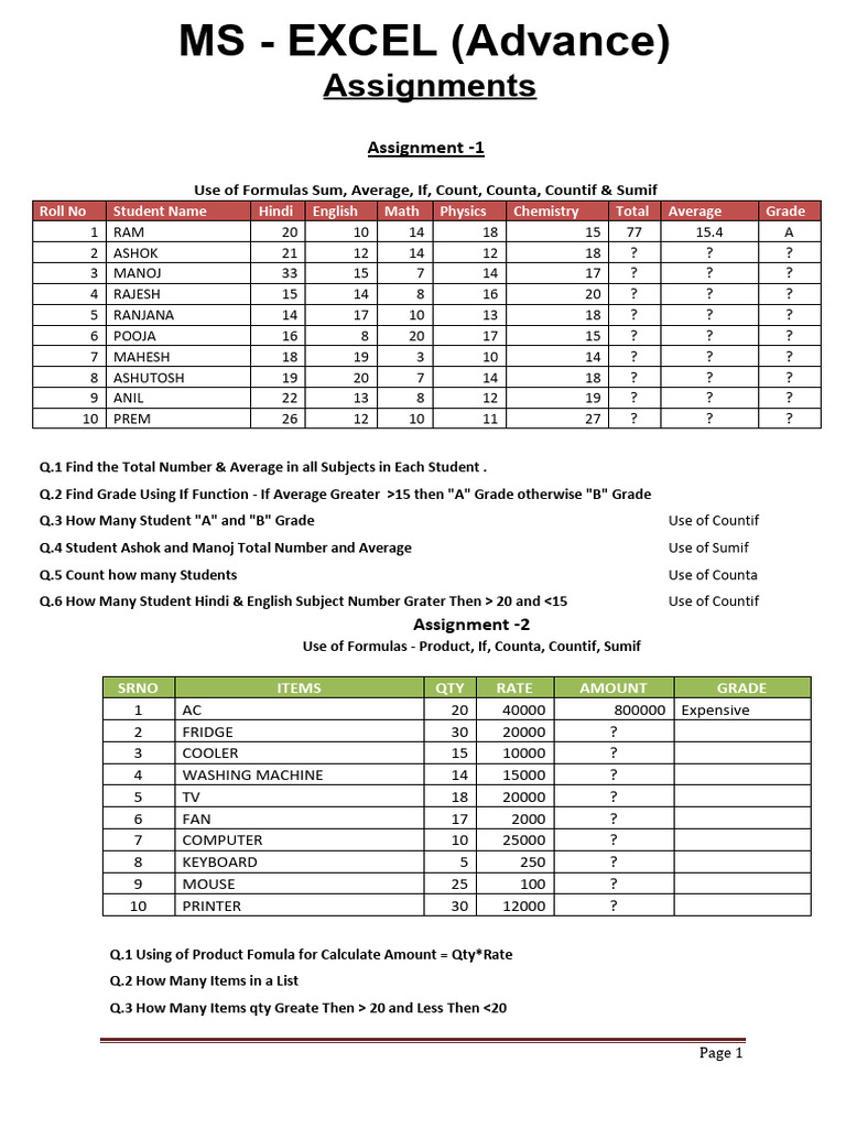 Free MS Excel Assignments for Practice