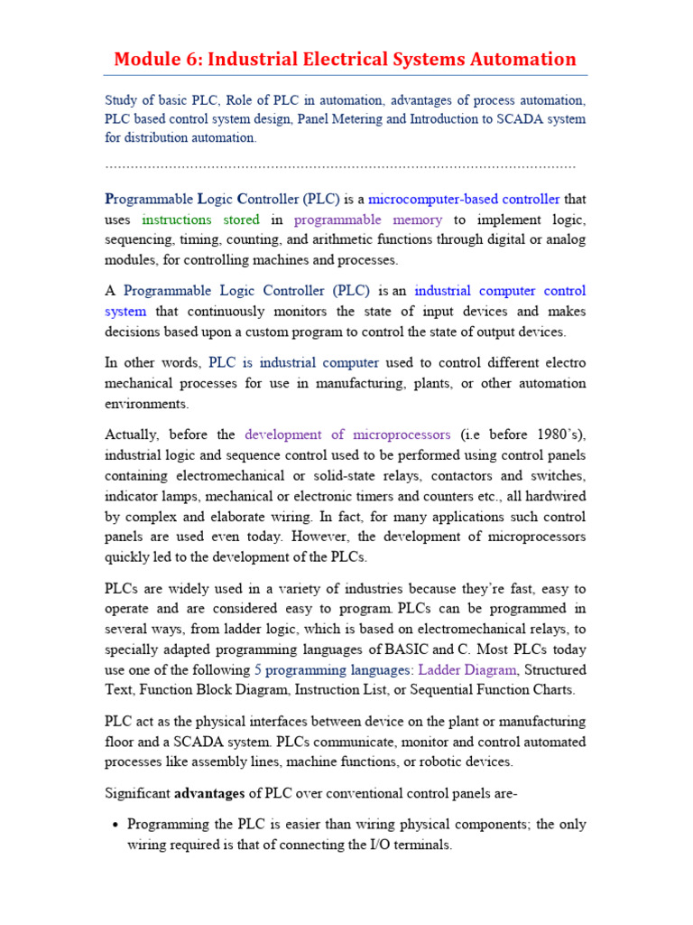 PLC based control system design, Panel Metering and Introduction to SCADA system