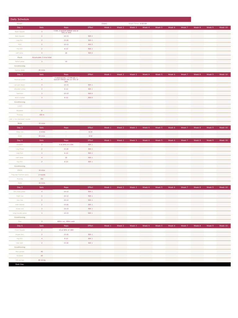 Day 6 Sets Reps Effort Week 1 Week 2 Week 3 Week 4 Week 5 Week 6 Week 7 Week 8 Week 9 Week 10