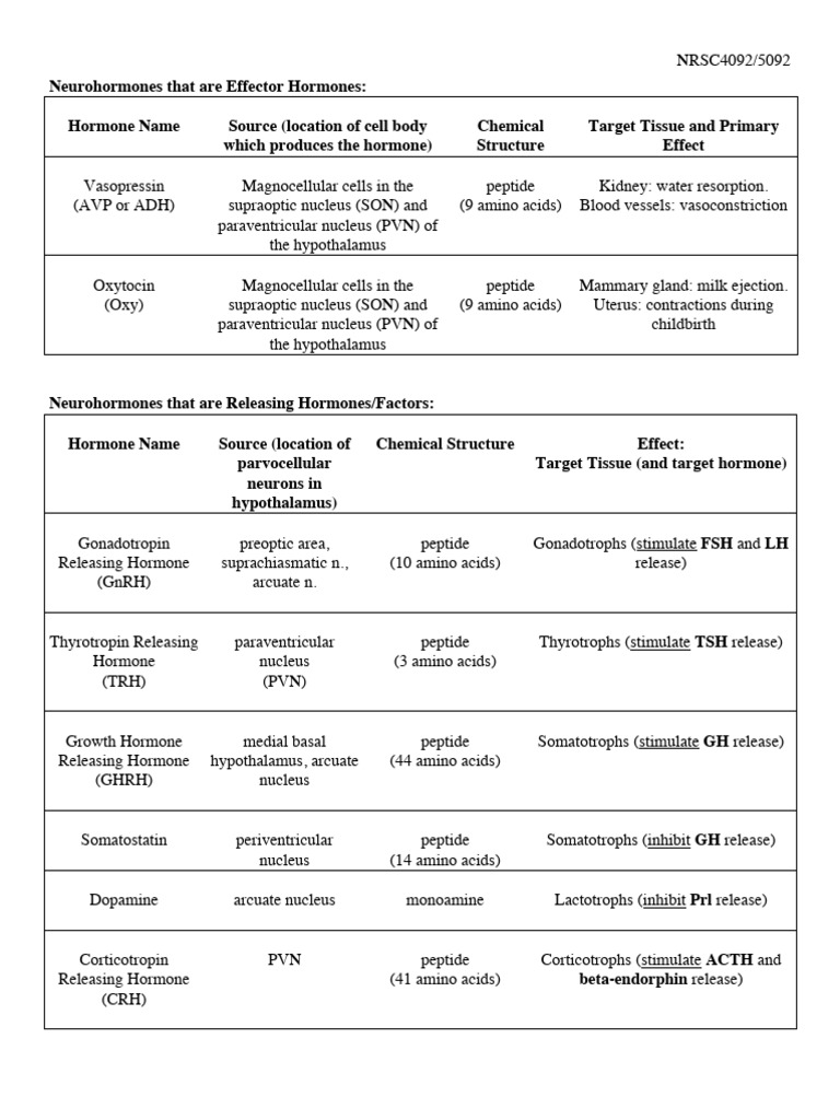 (AVP or ADH) supraoptic nucleus (SON) and (9 amino acids) Blood vessels: vasoconstriction