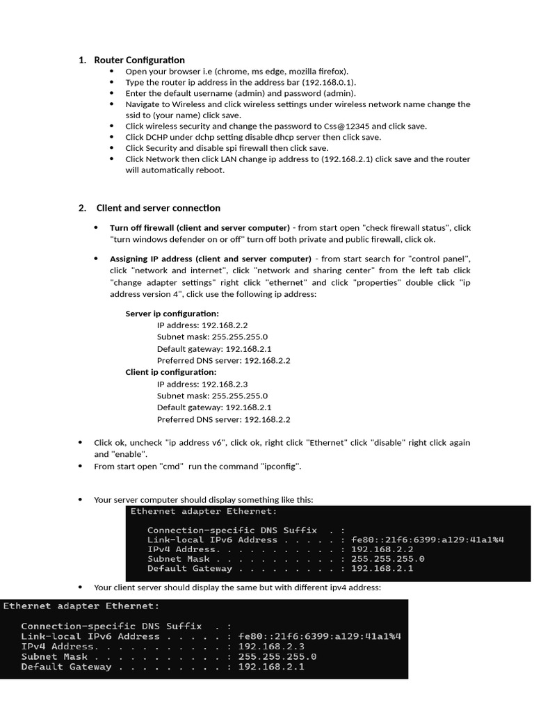 Assigning IP address (client and server computer) - from start search for "control panel",