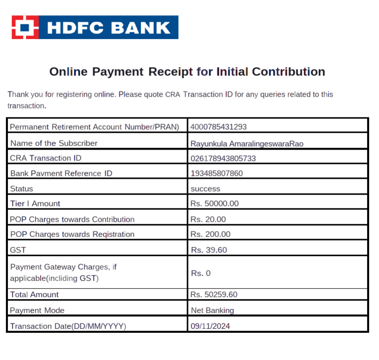 Permanent Retirement Account Number/PRAN) 4000785431293