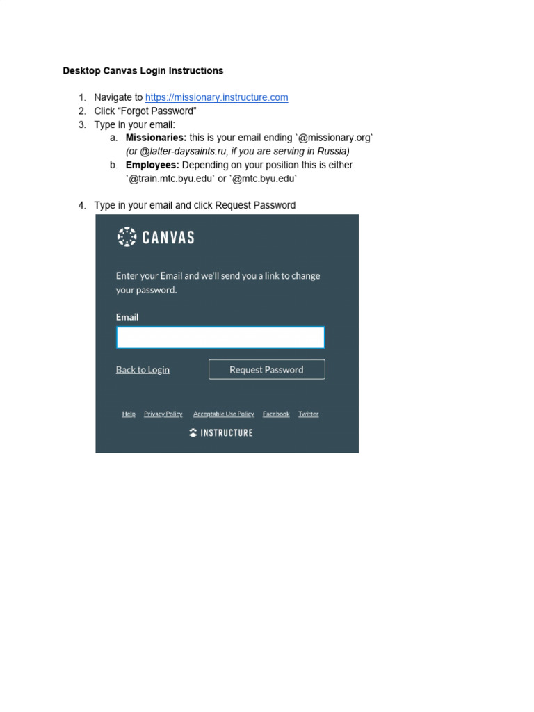 4. If it is your first time ever logging on to https://missionary.instructure.com, you will need