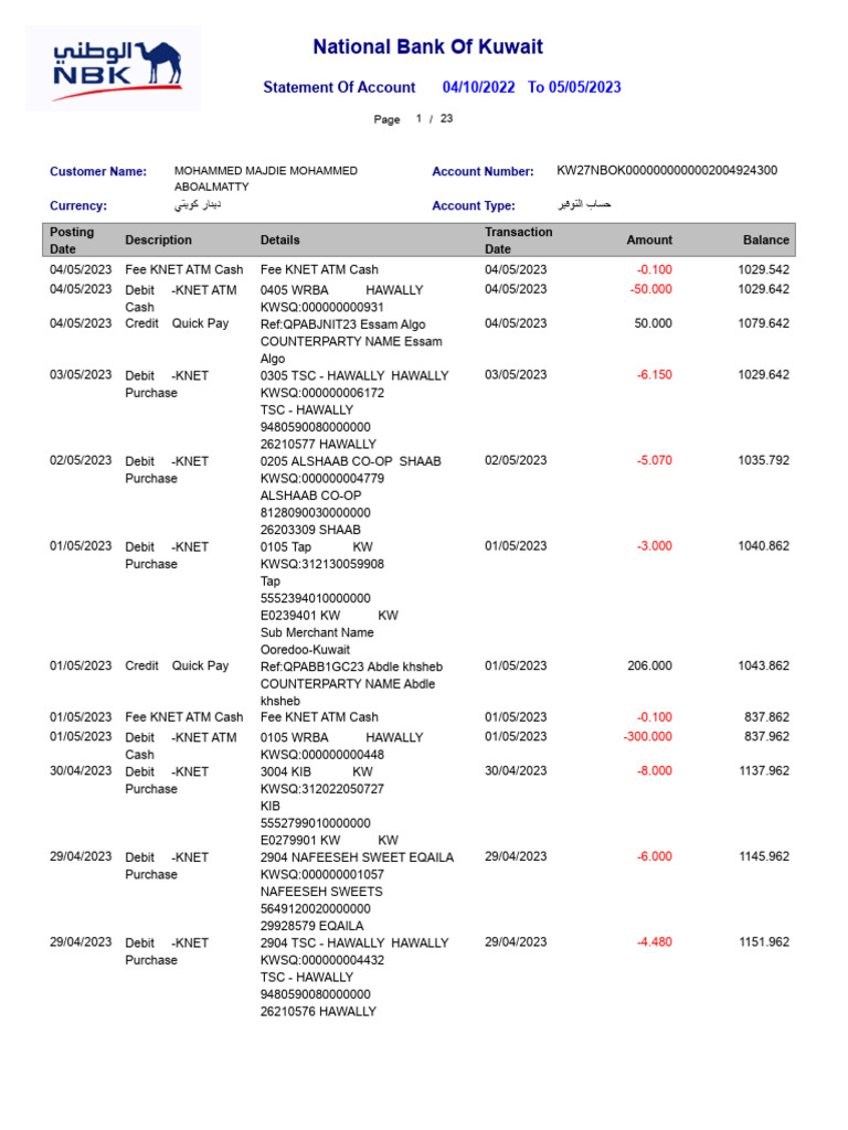 29/04/2023 Debit -KNET 2904 NAFEESEH SWEET EQAILA 29/04/2023 -6.000 1145.962