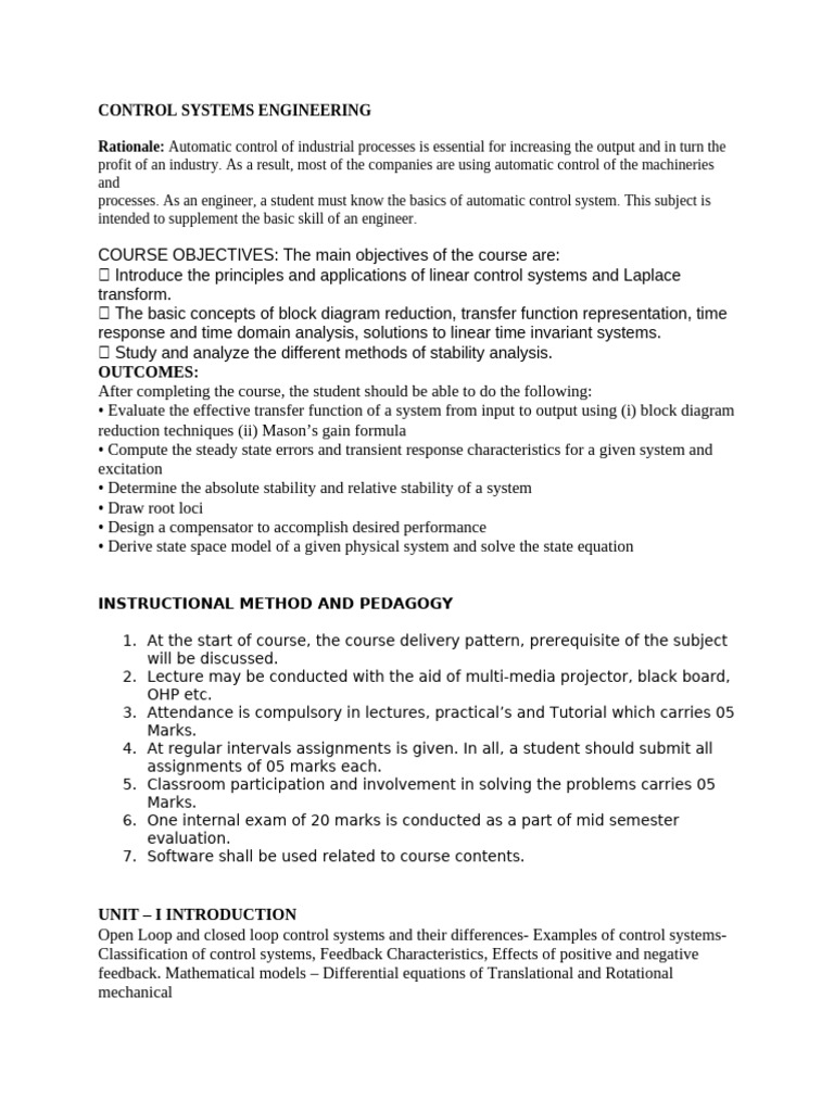 processes. As an engineer, a student must know the basics of automatic control system. This subject is