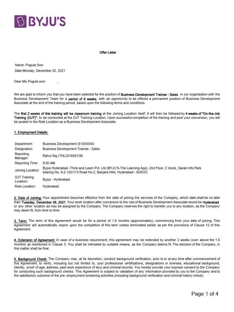 than Tuesday, December 28, 2021 .Your work location after conversion to the role of Business Development Associate would be Hyderabad