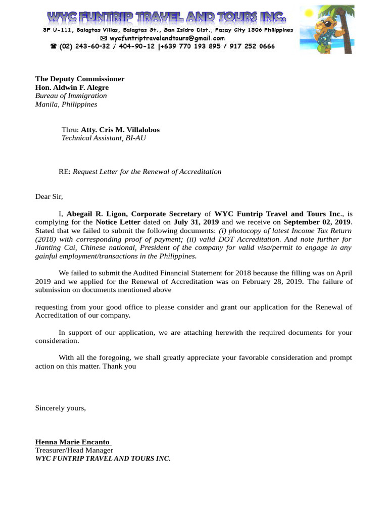 I, Abegail R. Ligon, Corporate Secretary of WYC Funtrip Travel and Tours Inc., is