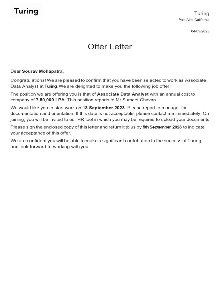 Data Analyst at Turing. We are delighted to make you the following job offer: