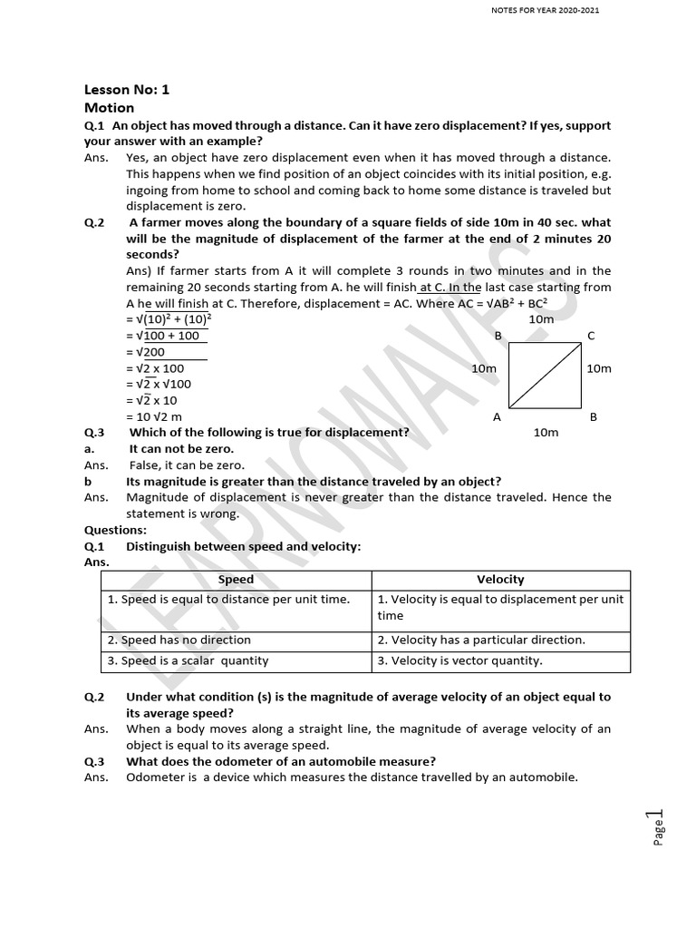Q.1 An object has moved through a distance. Can it have zero displacement? If yes, support