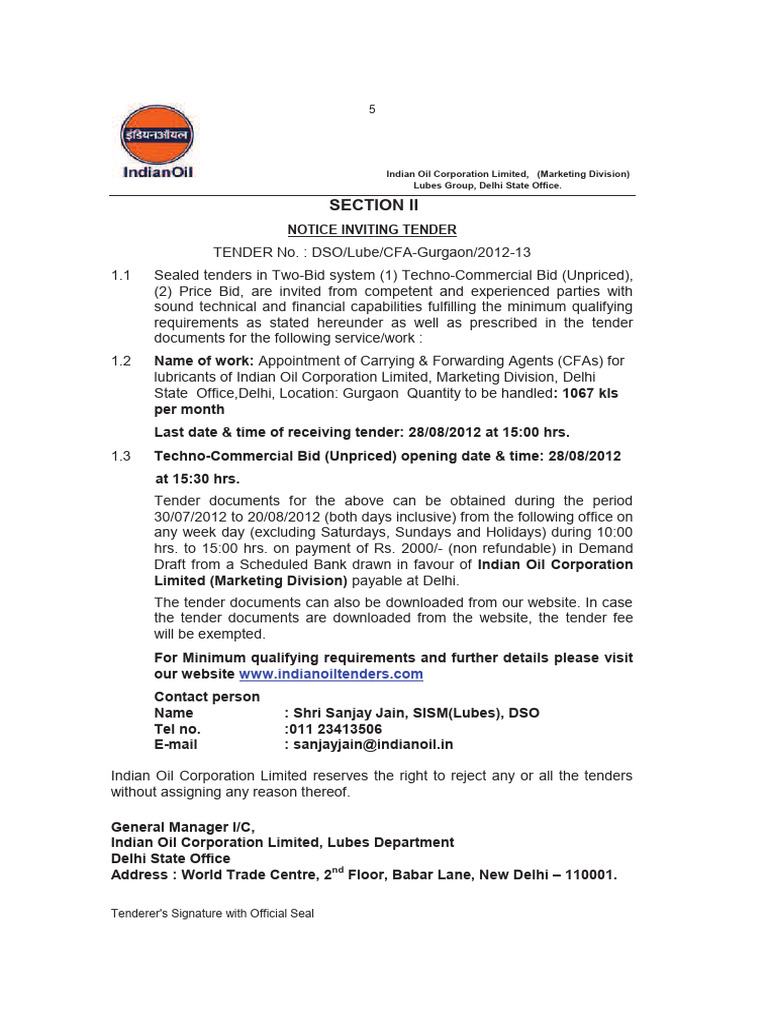 TENDER No. : DSO/Lube/CFA-Gurgaon/2012-13