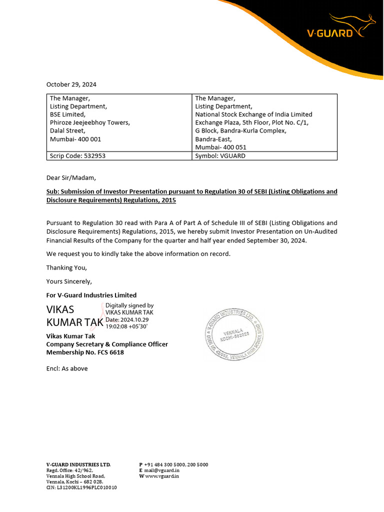 V-Guard Industries Limited (BSE:532953, NSE: VGUARD) is a Kochi based company,