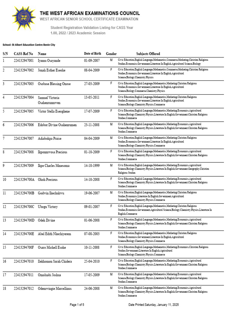 S/N CASS Ref No Name Date of Birth Gender Subjects Offered