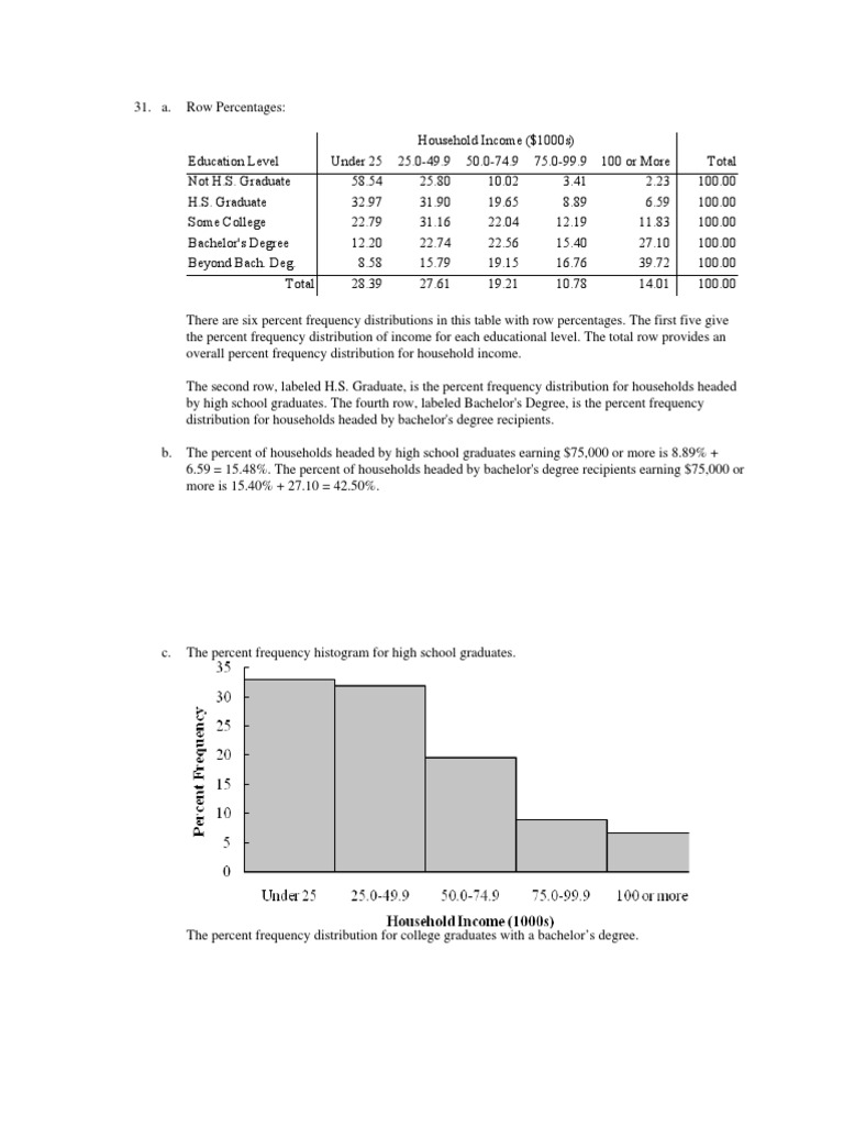The histograms show clearly that households headed by a college graduate with a bachelors degree earn more than households headed by a high school graduate. Yes, there is a positive relationship between education level and income. 32. a. Column Percentages: Household Income ($1000s) 25.0-49.9 50.0-74.9 75.0-99.9 100 or More 14.82 8.27 5.02 2.53 35.56 31.48 25.39 14.47 29.77 30.25 29.82 22.26 14.43 20.56 25.03 33.88 5.42 9.44 14.74 26.86 100.00 100.00 100.00 100.00