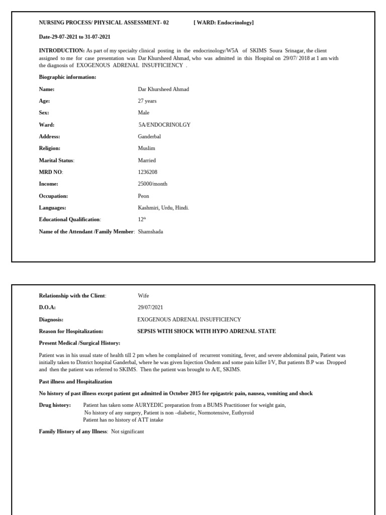 My patients namely DAR KHURSHEED AHMAD, 26 years old male with the diagnosis of ADRENAL INSUFFICIENCY, commonly
