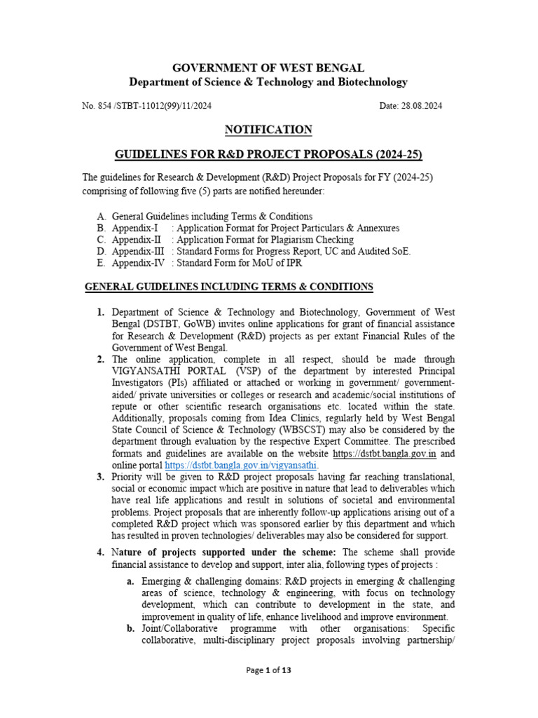Technology and Biotechnology, Government of West Bengal makes the following guidelines