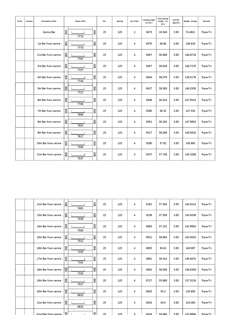 Sl. No. Location Description of Bar Shape of Bar Dia. Spacing No. of Bar Length (in Weight (in kgs) Remarks