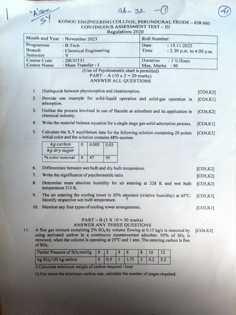4. Write the material ba lance equation for a si ngle stage gas-solid adsorption process. [CO4,Kl]