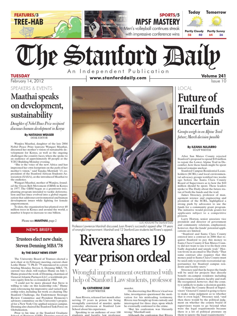 Juan Rivera, released last month after serving 19 years in prison for being wrongfully convicted of murder, spoke yesterday afternoon at Stanford Law School about his experience. Speaking to an audience of over 100 students and faculty, law professor Lawrence Marshall Riveras lead appellate counsel recounted his clients ordeal. Riveras case began in 1992 when 11year old Holly Staker was found violently raped and murdered in her home. Rivera, in jail at the time on a minor, nonviolent charge, told a fellow inmate that he had seen a suspicious person entering and leaving a party in the vicinity of the