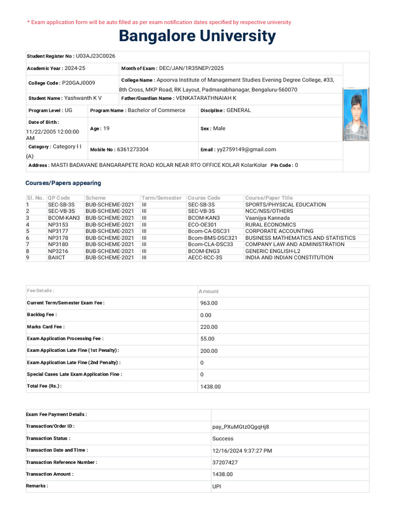 Student Name : Yashwanth K V Father/Guardian Name : VENKATARATHNAIAH K