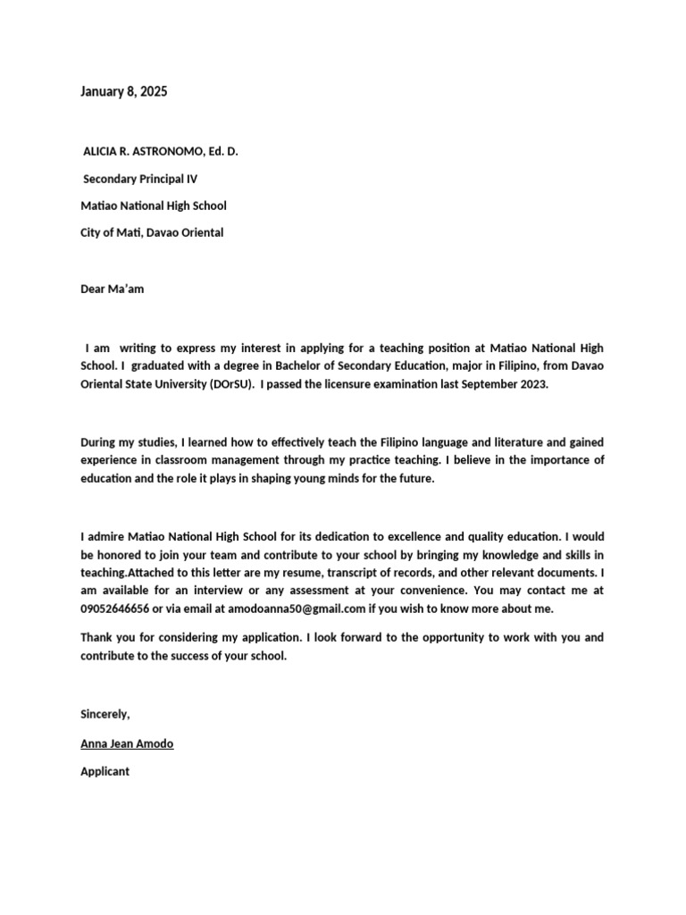 I am writing to apply for the position of Filipino Teacher I have a passion for teaching and