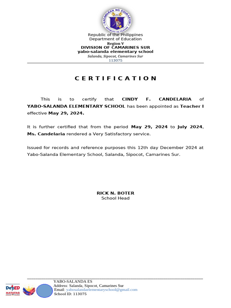 YABO-SALANDA ELEMENTARY SCHOOL has been appointed as Teacher I