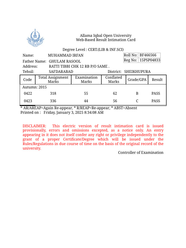 Father Name: GHULAM RASOOL Reg No: 15PSP04833