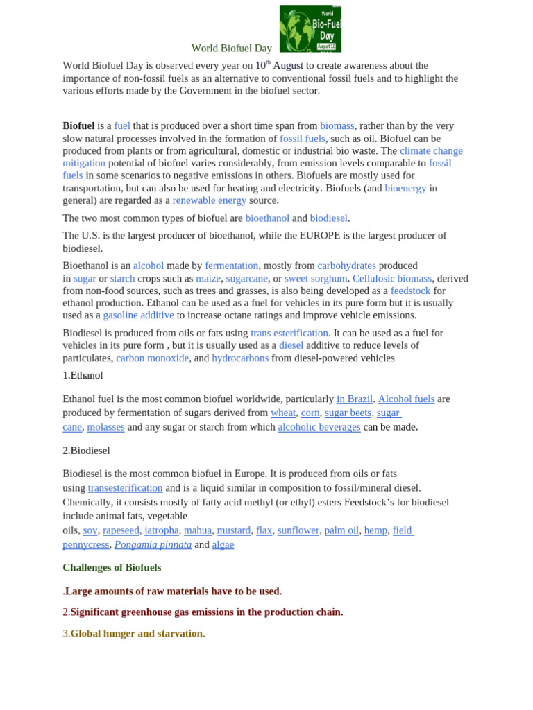 World Biofuel Day is observed every year on 10th August to create awareness about the