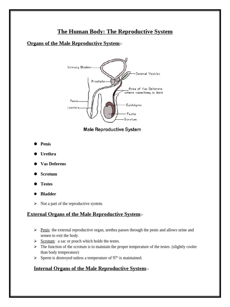 Penis: the external reproductive organ, urethra passes through the penis and allows urine and