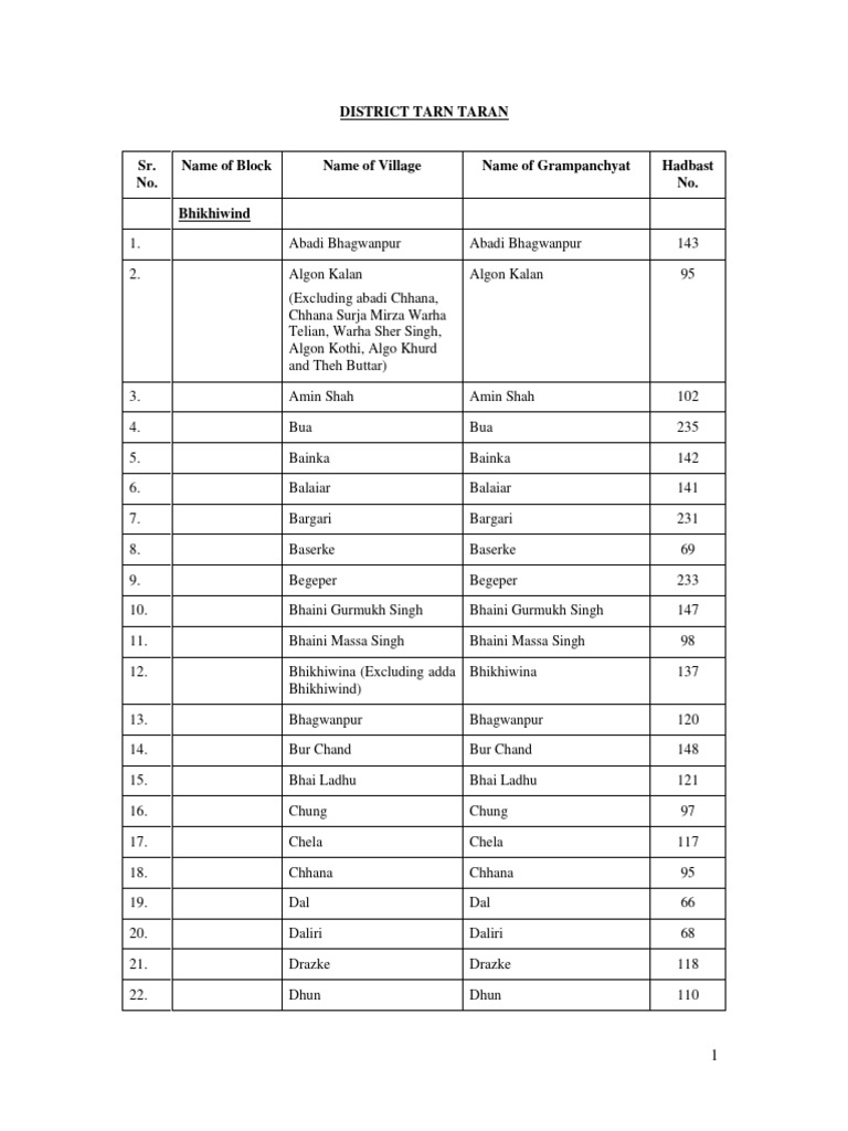 Sr. Name of Block Name of Village Name of Grampanchyat Hadbast