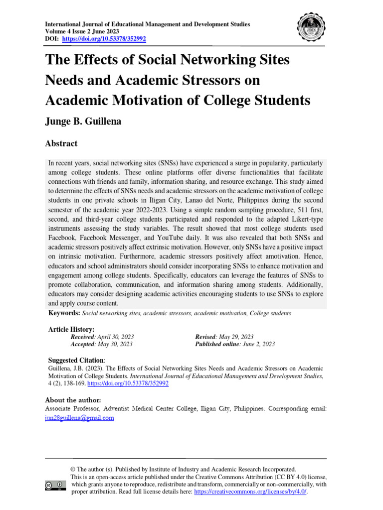 Guillena, J.B. (2023). The Effects of Social Networking Sites Needs and Academic Stressors on Academic