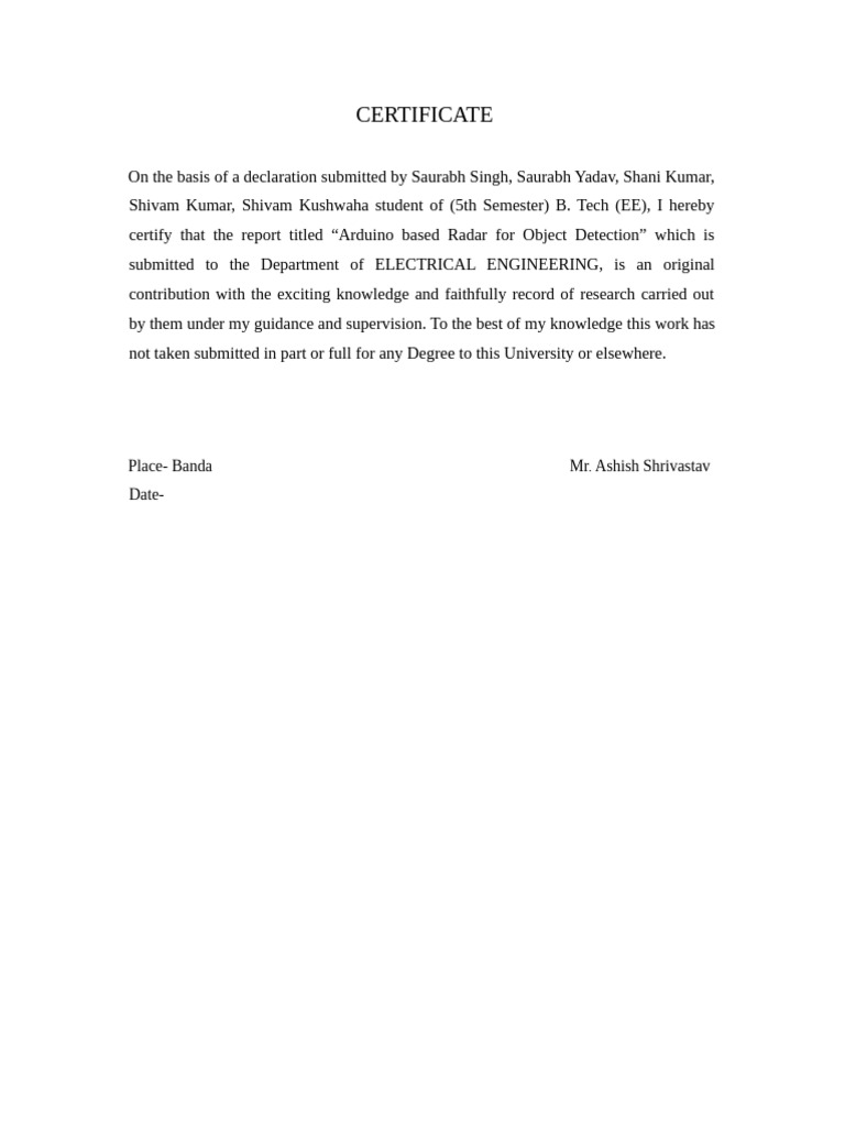 certify that the report titled “Arduino based Radar for Object Detection” which is