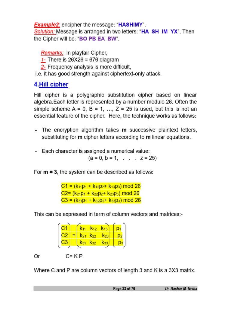 C3 = (k31p1 + k32p2+ k33p3) mod 26