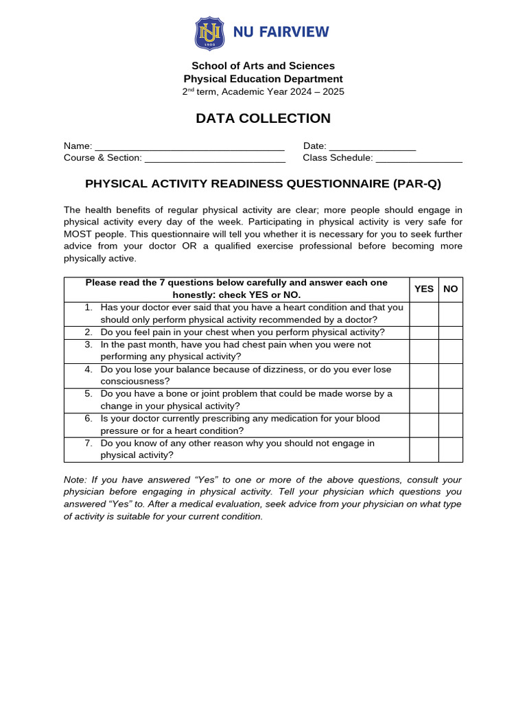 PHYSICAL ACTIVITY READINESS QUESTIONNAIRE (PAR-Q)