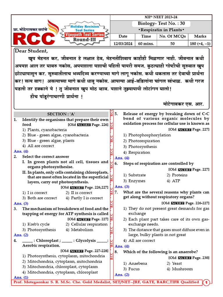 Dear Student,: Biology-Test No.: 30