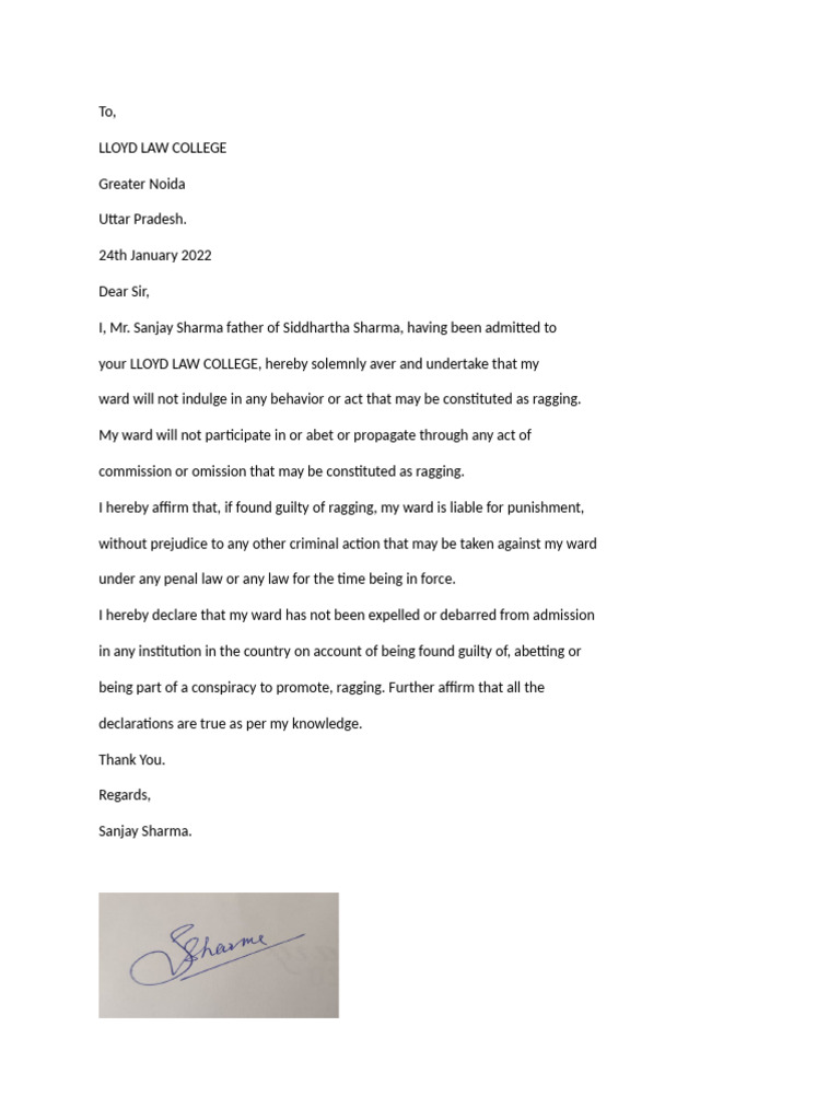 I, Mr. Sanjay Sharma father of Siddhartha Sharma, having been admitted to