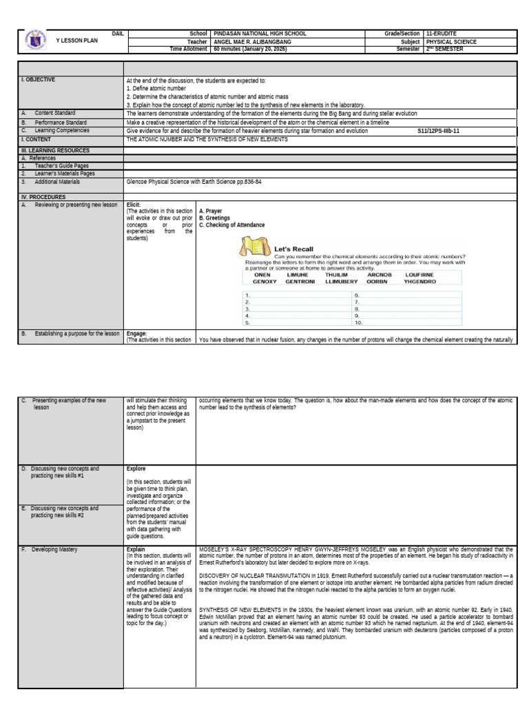 Y LESSON PLAN Teacher ANGEL MAE R. ALIBANGBANG Subject PHYSICAL SCIENCE