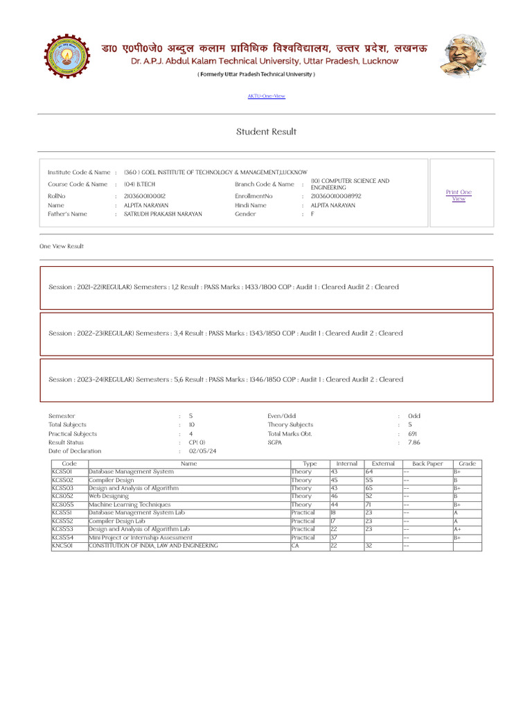 Session : 2023-24(REGULAR) Semesters : 5,6 Result : PASS Marks : 1346/1850 COP : Audit 1 : Cleared Audit 2 : Cleared