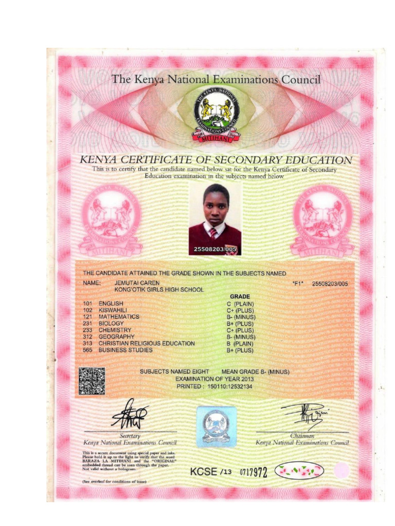2010 - 2013 Kong’otik Girls Secondary school KCSE Certificate