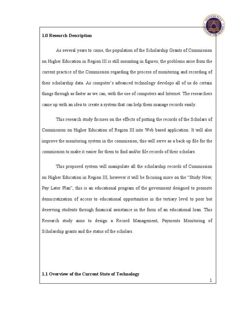 0 Research Description As several years to come, the population of the Scholarship Grants of Commission on Higher Education in Region III is still mounting in figures; the problems arise from the current practice of the Commission regarding the process of monitoring and recording of their scholarship data. As computers advanced technology develops all of us do certain things through as faster as we can, with the use of computers and Internet. The researchers came up with an idea to create a system that can help them manage records easily. This research study focuses on the effects of putting the records of the Scholars of Commission on Higher Education of Region III into Web based application. It will also improve the monitoring system in the commission; this will serve as a back up file for the commission to make it easier for them to find and/or file records of their scholars. This proposed system will manipulate all the scholarship records of Commission on Higher Education in Region III, however it will be focusing more on the Study Now, Pay Later Plan, this is an educational program of the government designed to promote democratization of access to educational opportunities in the tertiary level to poor but deserving students through financial assistance in the form of an educational loan. This Research study aims to design a Record Management, Payments Monitoring of Scholarship grants and the status of the scholars.