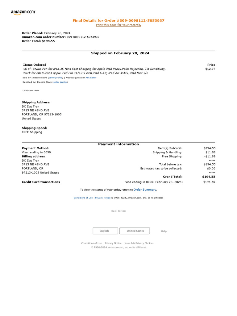 Credit Card transactions Visa ending in 0090: February 28, 2024: $194.55