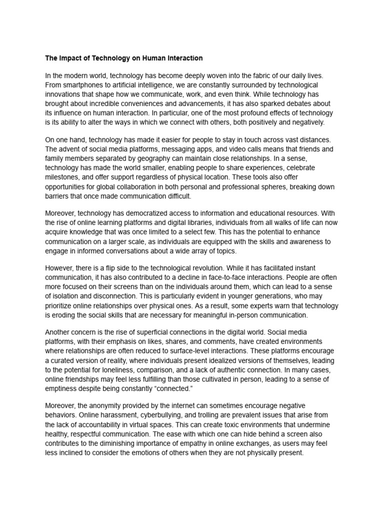 its influence on human interaction. In particular, one of the most profound effects of technology
