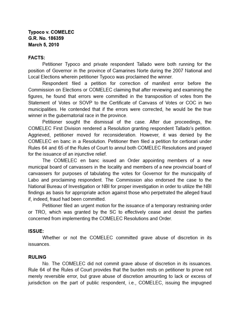 Petitioner Typoco and private respondent Tallado were both running for the